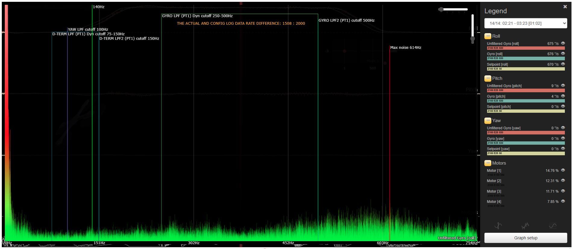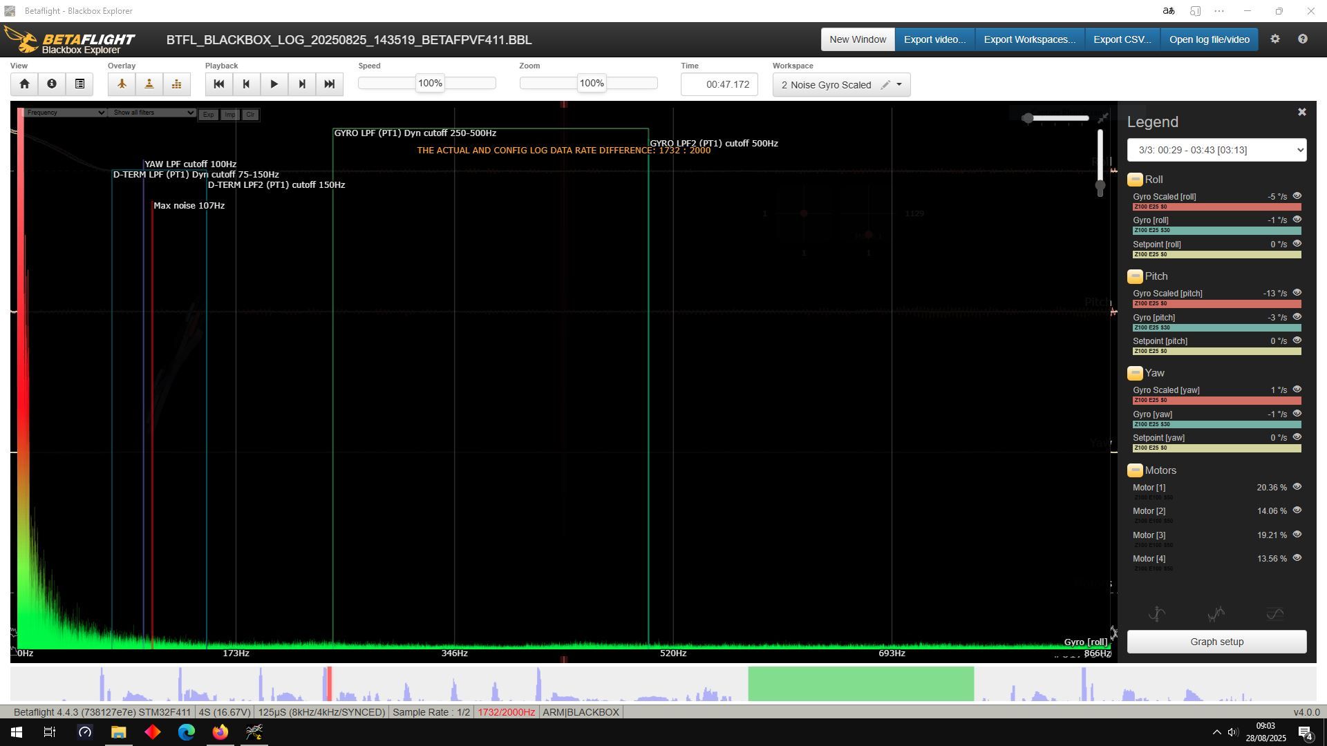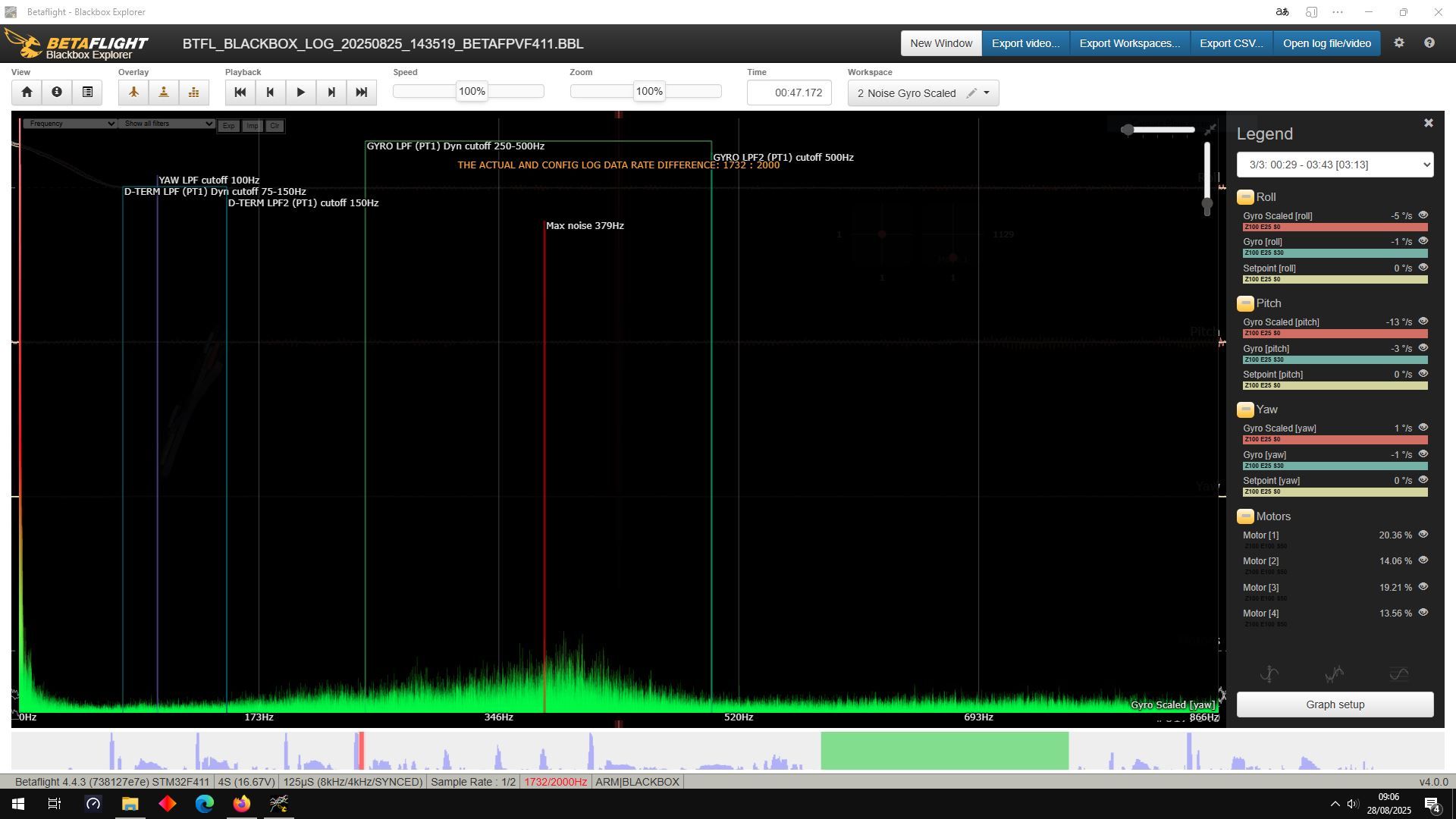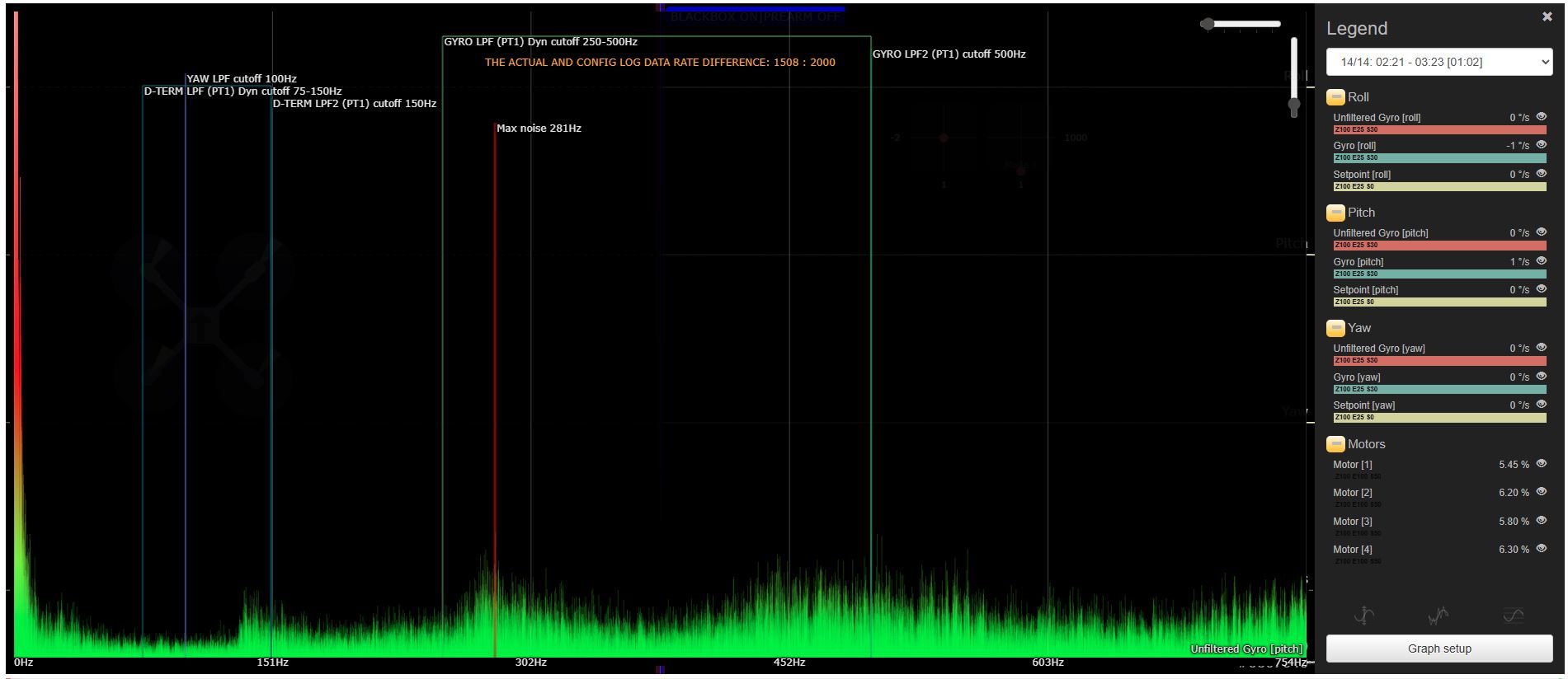 Helisud Posté(e) Aout 28 Signaler Posté(e) Aout 28 Bonjour, Je viens de monter une Frame RacerX ET-5, Moteurs Betafpv 1505, 3600Kv, Helices HQprop 5x3, le tout avec des accus 650mAh et un DJI Airunit 04 Lite. Les Blackbox des premiers vols montrent un bruit assez diffus, je précise que tout est bien serré, carte montée sur soft mounts, les hélices sont neuves et le drone n'a pas prix de shoot. Je vous partage des captures d'écran pour si c'est possible avoir quelques conseil concernant la stratégie de filtres à mettre en place ou modifier afin d'avoir ce qu'il faut mais pas plus. Les pids n'ont pas encore été ajustés, j'ai des oscillations en full gaz et un peu de propwash. Merci à ceux qui voudront bien se pencher sur mon cas !