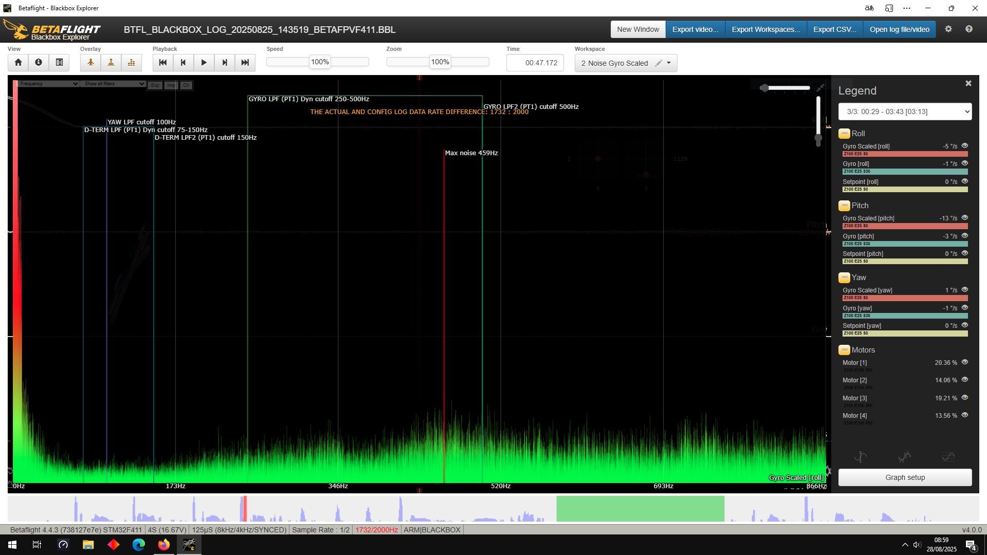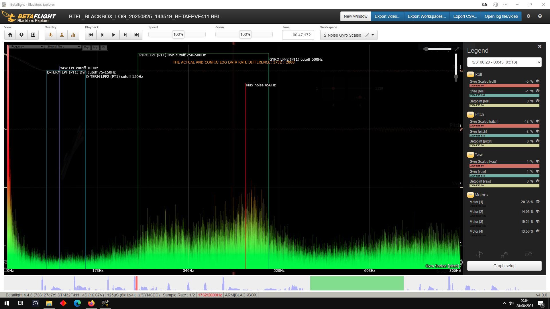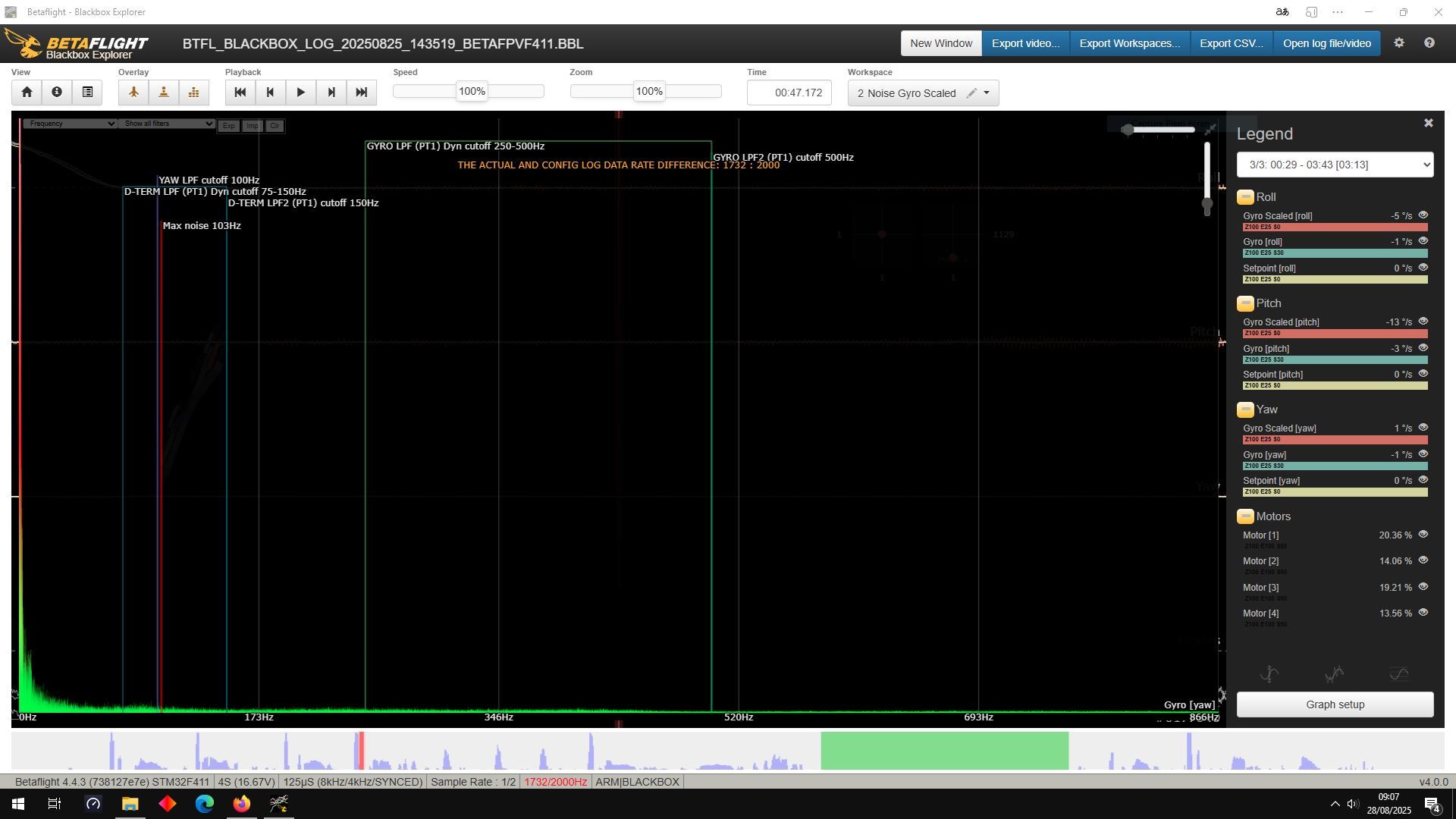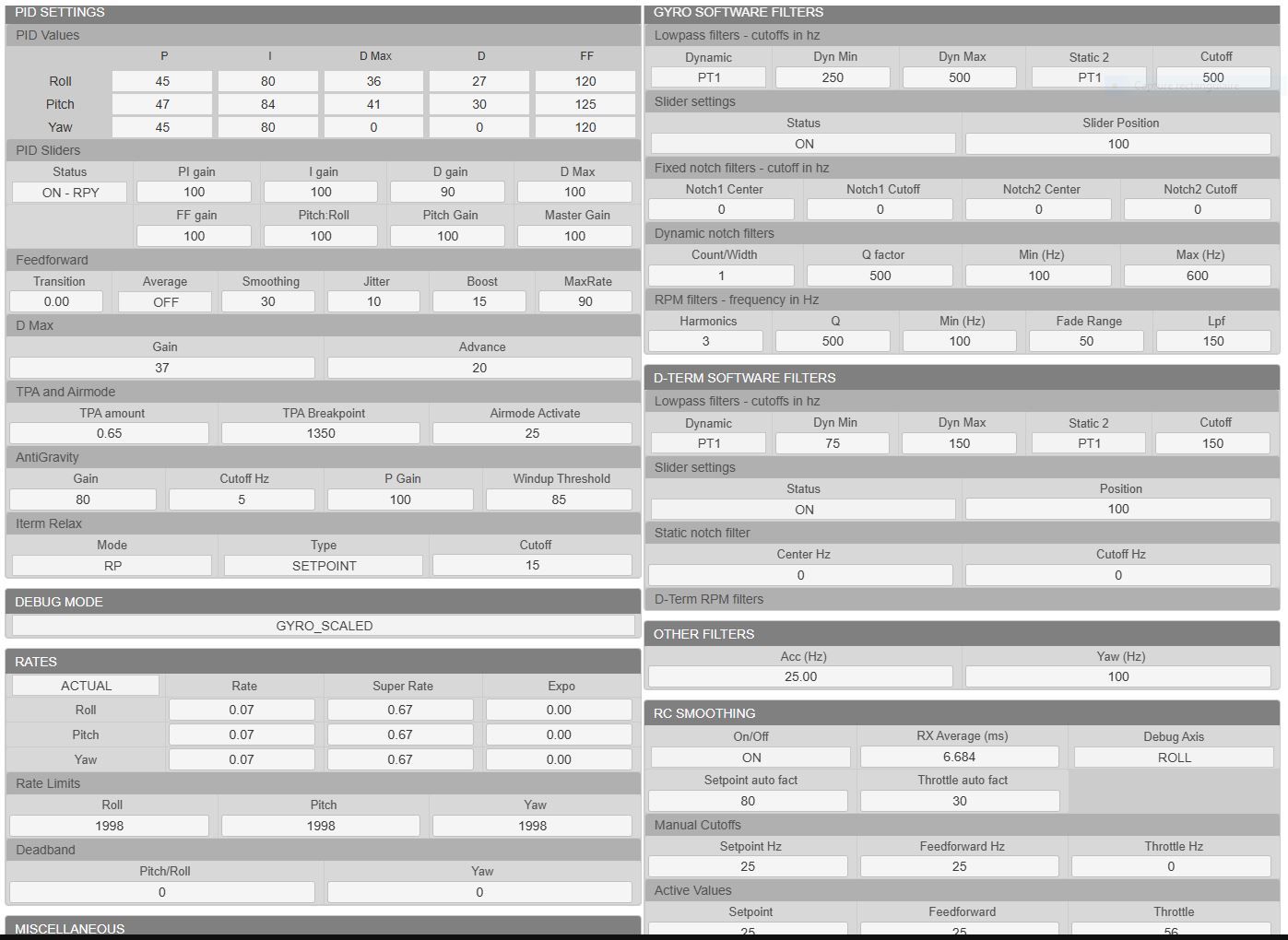 Helisud Posté(e) Aout 28 Signaler Posté(e) Aout 28 Bonjour, Je viens de monter une Frame RacerX ET-5, Moteurs Betafpv 1505, 3600Kv, Helices HQprop 5x3, le tout avec des accus 650mAh et un DJI Airunit 04 Lite. Les Blackbox des premiers vols montrent un bruit assez diffus, je précise que tout est bien serré, carte montée sur soft mounts, les hélices sont neuves et le drone n'a pas prix de shoot. Je vous partage des captures d'écran pour si c'est possible avoir quelques conseil concernant la stratégie de filtres à mettre en place ou modifier afin d'avoir ce qu'il faut mais pas plus. Les pids n'ont pas encore été ajustés, j'ai des oscillations en full gaz et un peu de propwash. Merci à ceux qui voudront bien se pencher sur mon cas !