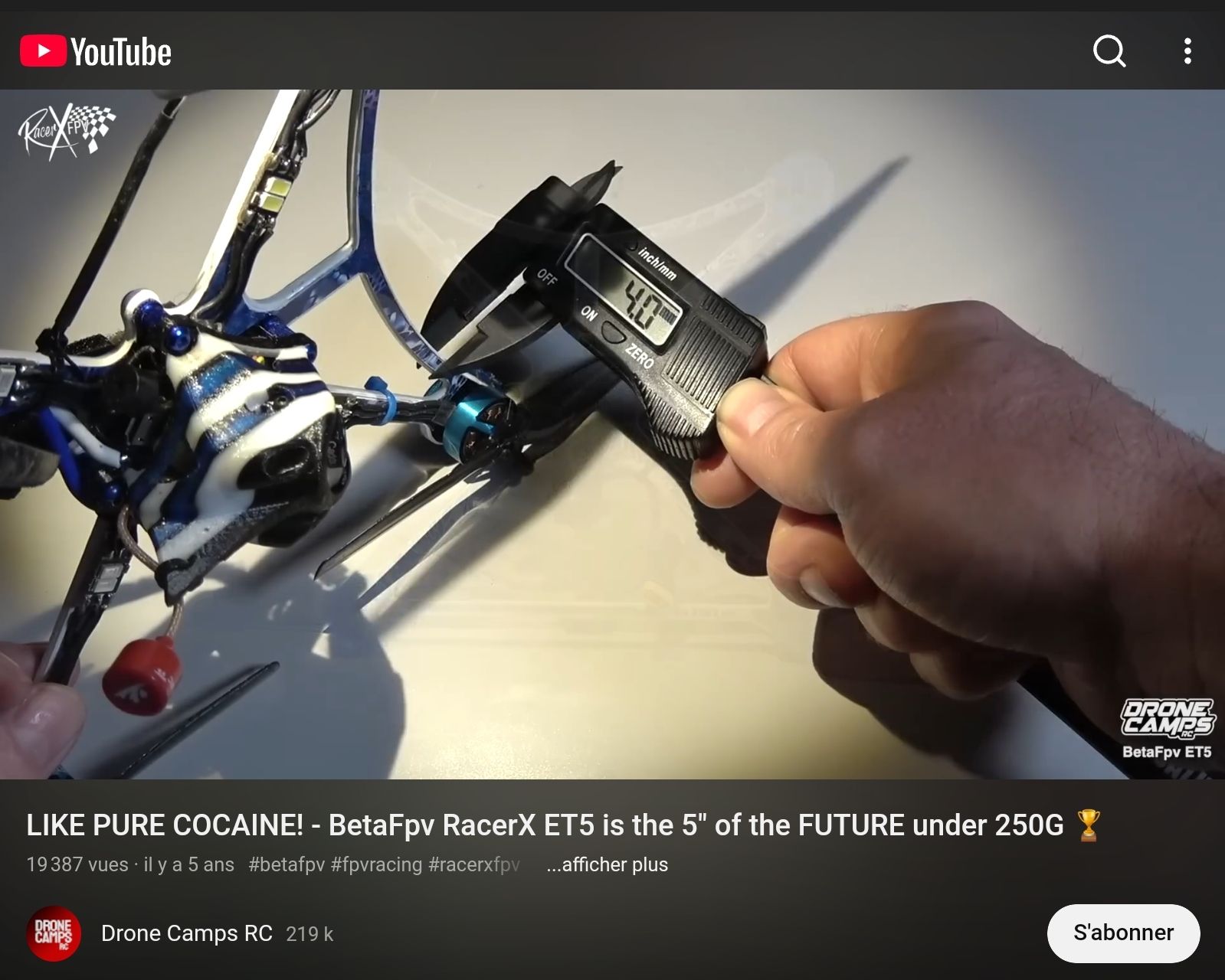 nochamo Posté(e) Aout 30 Signaler Posté(e) Aout 30 (modifié) il y a 21 minutes, Jerome a dit : moteurs à 3600 KV ( pour du 4S, c’est pas si fatal ca reste un gros TP..... mais il y a une enorme commu ultra fan des twig de toutes tailles. il y a toujours quelques vibrations par ci par là, mais ca vole quand meme pas si mal, c’est ultra leger, ultra maniable, avec une autonomie consequente. faut juste taper gentil dans les crash...... shutterbug a fait pas mal de review dessus..... mais ca date..... il etait passé en 2004 sur des kv plus bas mais en 6S mais il y a aussi la review du build original, avec les plus petits moteurs en 4S : PS : je peux me planter, mais a l’oeil , c’est plutot du 4mm d’epais PS : je peux me planter, mais a l’oeil , c’est plutot du 4mm d’epais @Jerome..... pfff..... regarde ce que tu m’obliges a regarder........ Modifié (le) Aout 30 par nochamo