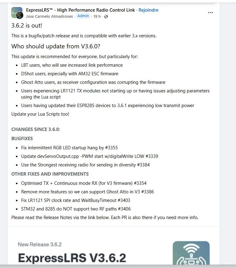 edf84 Posté(e) Novembre 19 Signaler Posté(e) Novembre 19 Une nouvelle version d'ExpressLRS 3.6.2 est disponible. Elle semble corriger certains bug. Je vais essayer ce soir 1