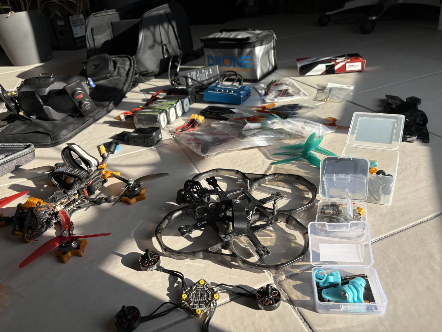 Kenkaio Posté(e) Septembre 18 Signaler Posté(e) Septembre 18 Bonjour à tous, Je me sépare de mon set complet de drone FPV par manque de temps. Voici le détail complet : Quad 1 – Lethal Conception Bando Killer V2.5 (5") Condensateur : Panasonic Low ESR 1000uF 35V Contrôleur de vol : T-Motor F7 HD Flight Controller ESC : F55A PRO II Caméra : DJI O3 Air Unit Moteurs : Moteur Emax ECO II Series 2306 - 1900KV Brushless Buzzer : Vifly Finder 2 - Buzzer Autonome GPS : Diatone - Mamba GPS/Beidou M220 TPU orange Bando Killer 5" V2 QUAD 2 - CineON C35 V2 Frame Kit AIO : AIO F745 35A BLS 25.5x25.5 Caméra : Nebula PRO Nano Vista Kit HD FPV System (HS) Moteurs : C224 - 2300KV Antenne : Récepteur ExpressLRS 2.4G Pour THOR Buzzer : Vifly Finder Mini - Buzzer Autonome Autre : Radio : RadioMaster - Zorro - ELRS Batteries Incluses Boite Radio : RadioMaster - Carring Case pour Zorro Testeur de batterie CellMeter-7 Sac de sécurité pour accu Lipo T-Motor Mini F45A + MiniF7 Stack (acheté par erreur, neuf, pas eu le temps de la renvoyer) Antenne TrueRC Singularity 5.8GHz SMA - LHCP Batteries : 1x CNHL Black Series 4x Ovonic 100C 6S 1300mAh GoPro Hero 8 avec 2 batteries Chargeur batterie Casque goggle DJI FPV V2 avec Antenne X-AIR 5.8 MK.II et antennes d'origines Tout un tas de jeu d'hélices (pour les deux quads) Câbles de rechanges batterie 1 frame Kayou Dur Sac torvol Infos supplémentaires : ~20 vols avec le Bando (et Kayou) ~5-6 vols avec le CineON Tout fonctionne parfaitement (sauf Nebula PRO HS) Set complet prêt à voler Le set complet vaut ~2200€, je le vend pour 1200€. Envoi possible à vos frais. Vente du set complet uniquement