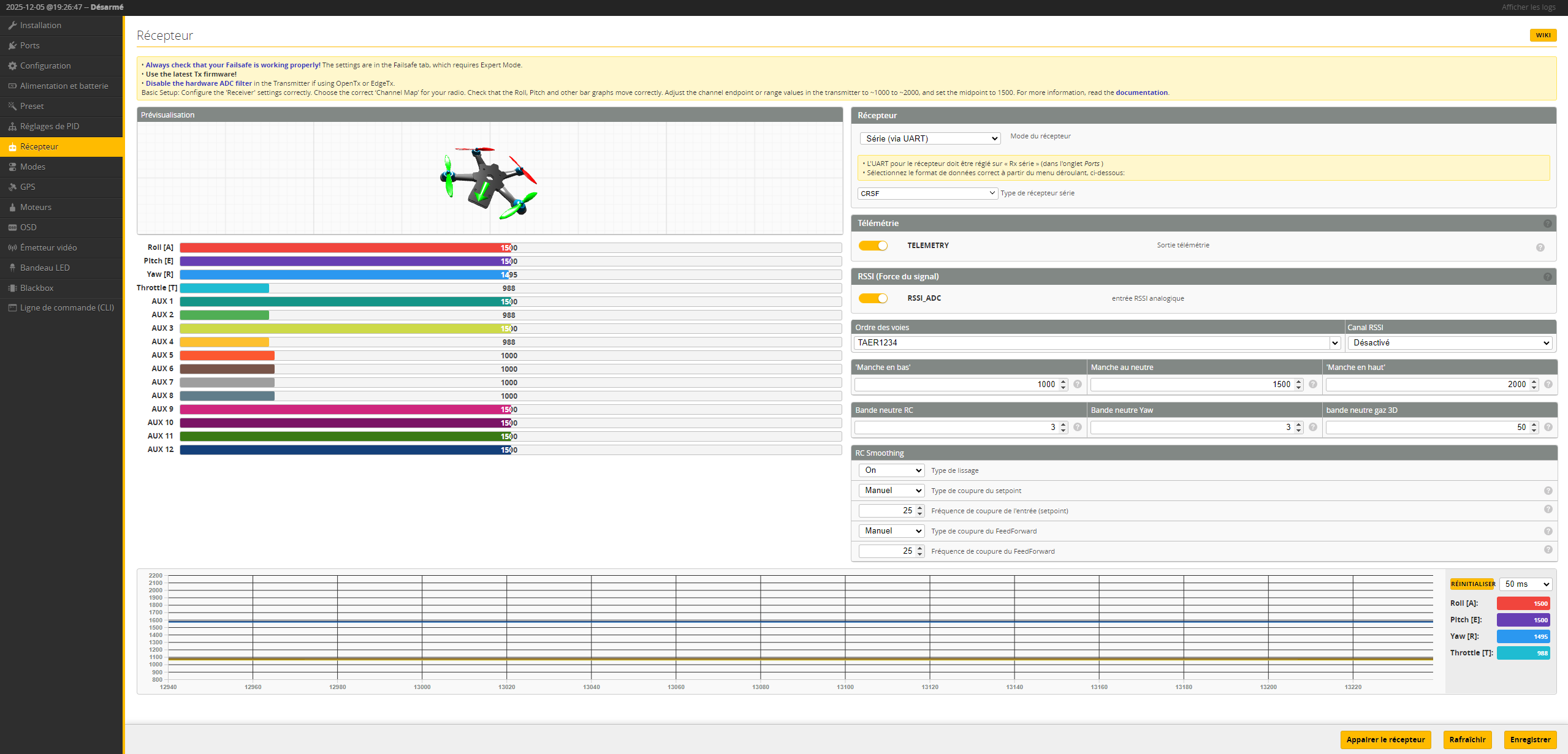 ledroneur Posté(e) il y a 2 heures Signaler Posté(e) il y a 2 heures Bonjour tous le monde. Je suis débutant dans le domaine et je n'ai encore aucune heure de vole IRL. J'ai investi dans un Nazgul5 DC5 ECO. J'ai suivi des tutos pour tout appairer et configurer mon drone avec BetaFlight. Lorsque je suis dans BetaFlight partie récepteur tout fonctionne correctement, mon Throttle oscille entre 988 et 2011 ce qui me semble normal. Lorsque je branche ma batterie et que j'arme mon drone (non je n'ai pas mis les helices), je constate que le pitch, yaw, roll et throttle répondent, mais à ma grande surprise lorsque je met a fond mon throttle et que je redescend au minimum ou même a la moitié par exemple, les moteurs tournes toujours a fond ! Est ce normal ? Je me dit peut être que c'est par ce que il n'y a pas d'hélice et que le drone ne bouge pas. J'ai pas envie de me retrouver sur le terrain et voir mon drone monter a fond non stop et le voir faire une magnifique chute des le départ ^^; Ou alors est ce que j'ai un réglage que j'ai loupé ? Merci d'avance pour votre aide.