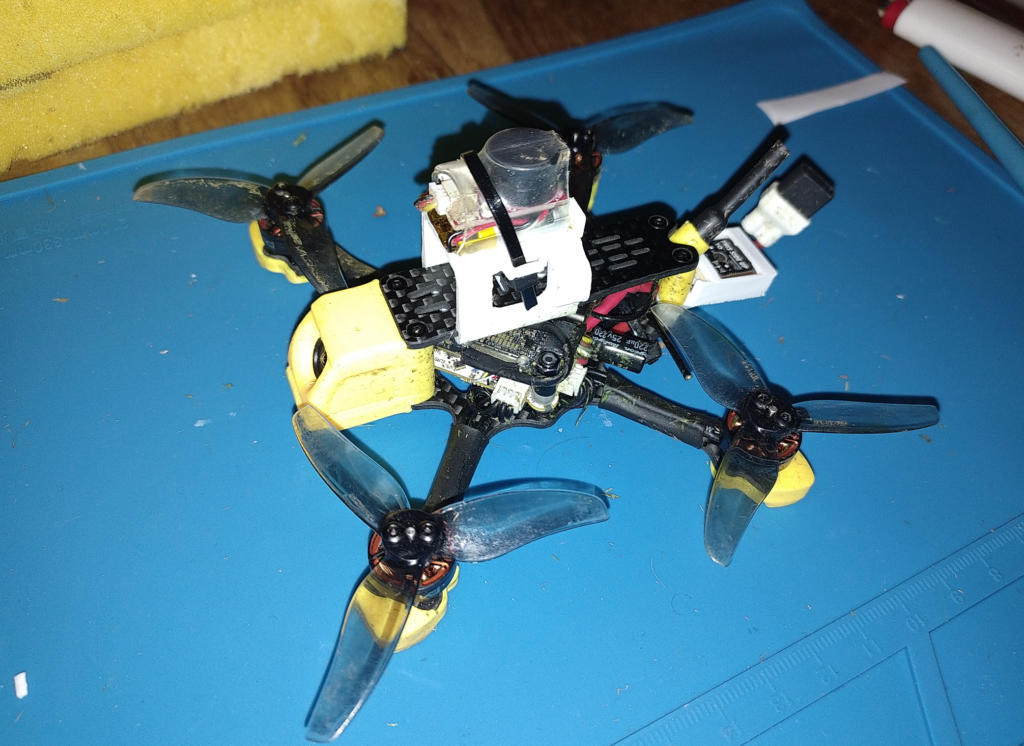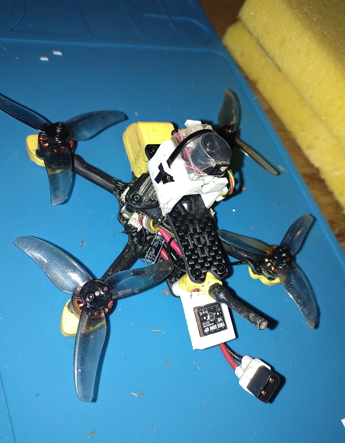 2ni Posté(e) hier à 21:06 Auteur Signaler Posté(e) hier à 21:06 Merci pour le conseil de buzzer! Et en effet c'est pas de trop... il y a qq jours, après un crash léger sans casse, j'ai mis 15min à retrouver mon drone dans les hautes herbes alors qu'il était à qq mètres seulement de moi... Je testé l'impression 3D pour mettre à jour mes TPU. Objectif, pouvoir fixer le buzzer, et mieux attacher la puce GPS. Et ça marche bien . La position du buzzer n'est pas très conventionnel, mais sur cette frame, je voyais pas bcp d'autre solution... La mini-batterie sur le buzzer est utile : petit crash après un décrochage (descente trop rapide à priori ) cet après midi, le buzzer a "sauté" de la frame au contact du sol, et le "beep" du buzzer m'a permis de le retrouvé à 1m du drone caché dans l'herbe, malgré sa déconnection. 1