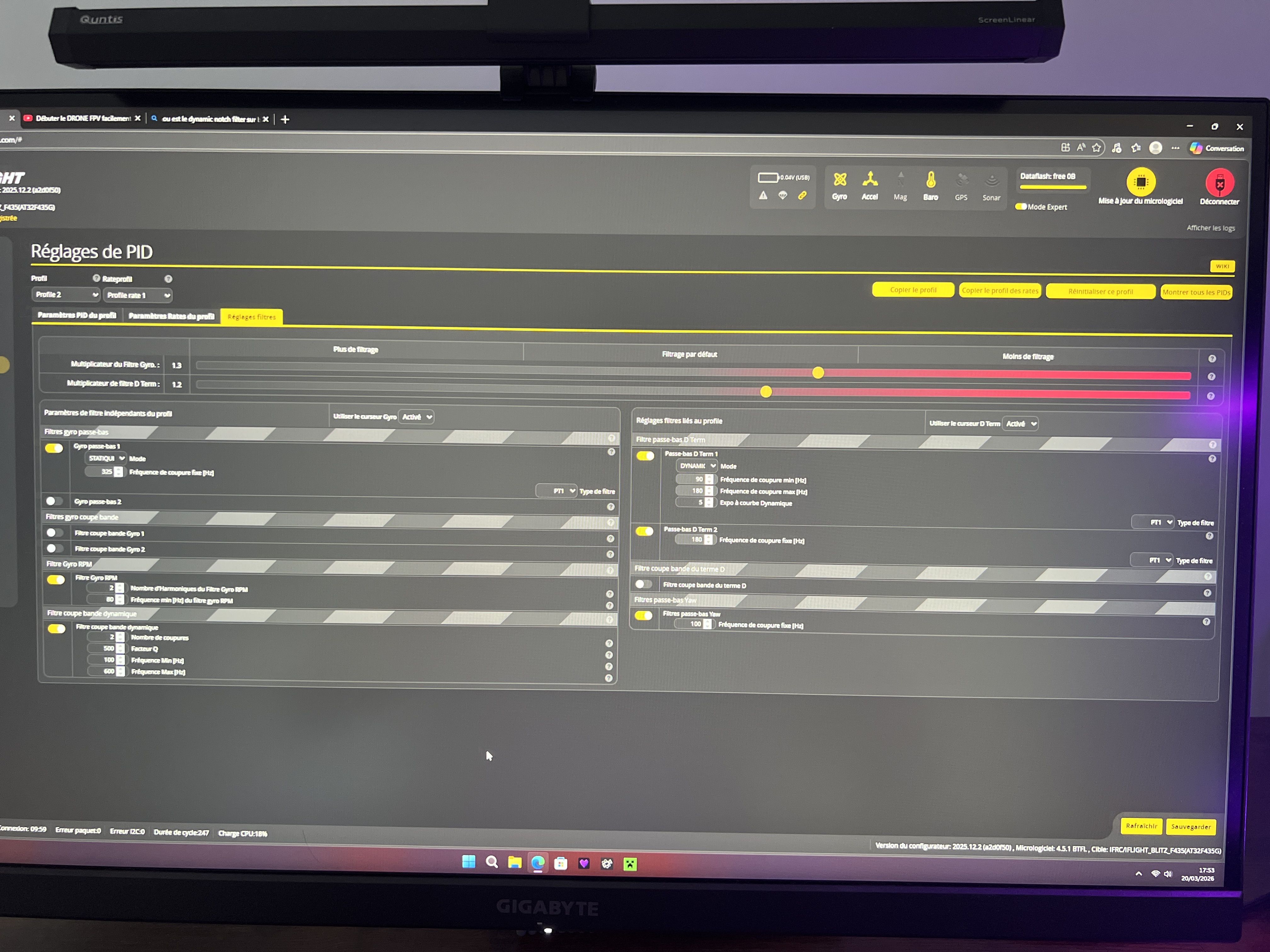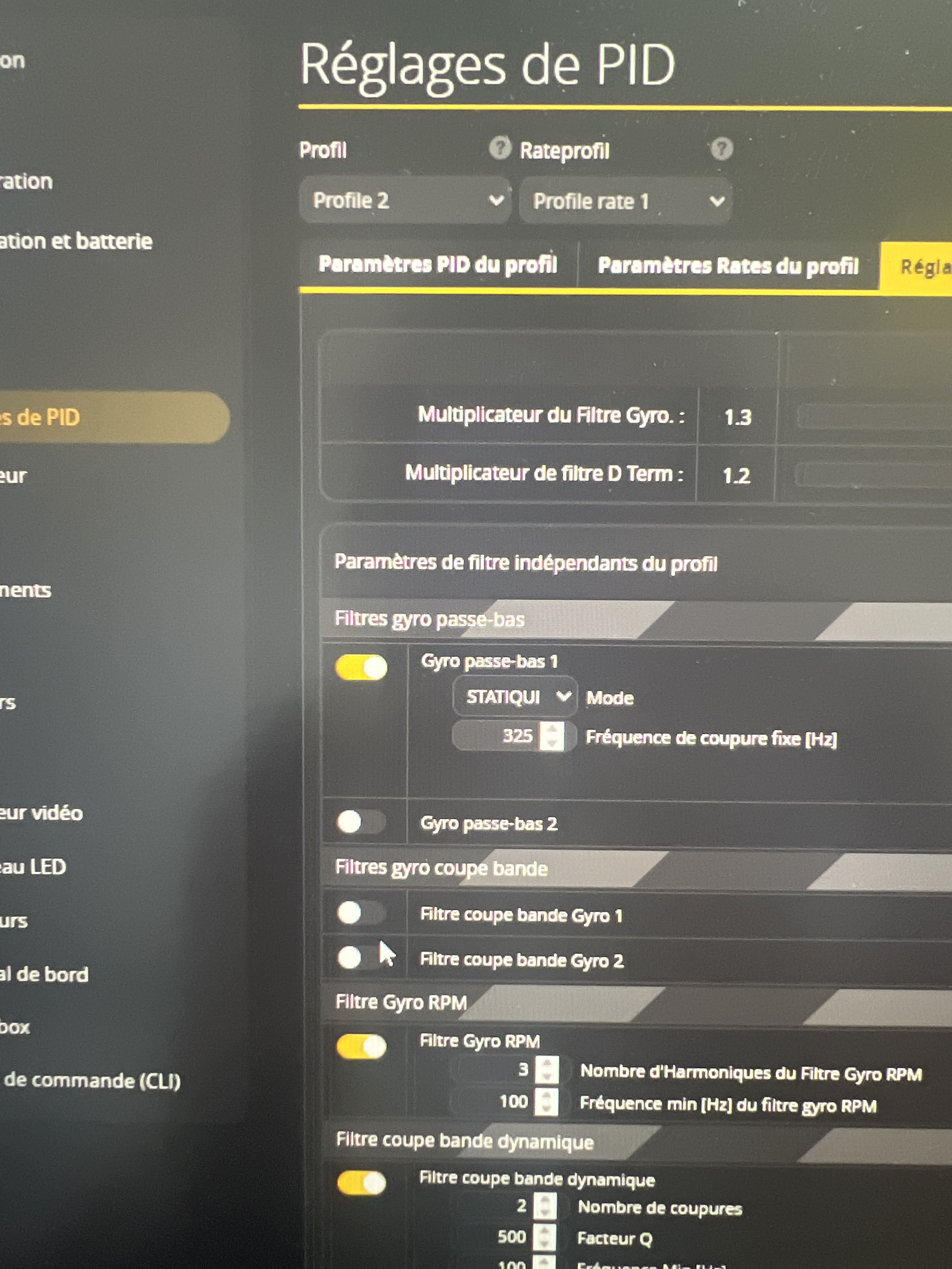 3. Désactive le Gyro (Dynamic) LPF1 et laisse le Gyro (static) LPF2 activé., mets son slider à 1.3. Mets le DTerm Slider à 1.2.